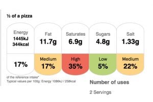 For pizzas sold as large (often over 600g) the recommended portion size is 1/4 (around 460 calories). So if you ate the whole thing, you’d be consuming nearly all your daily calories – in one meal! For all the shop-bought pizzas we analysed, none prominently displayed that the pizza served 2 people, although some did display nutritional information on the front of the box showing what half a pizza provides.