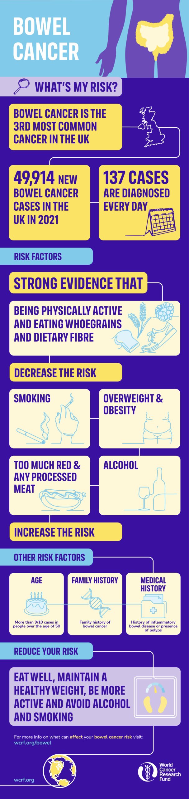 A bold, colourful infographic showing how you can reduce your risk of developing bowel cancer. Download today and share on your socials.